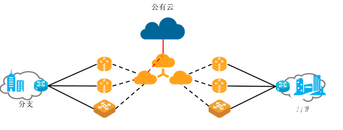 这种场景下,运营商可以建立一张专网,接入各种公有云资源。在企业分支(/总部)的CPE设备(或者运营商的边缘云节点),能够识别出公有云业务,并且将业务流发送到运营商最近的公有云接入(/交换)节点。